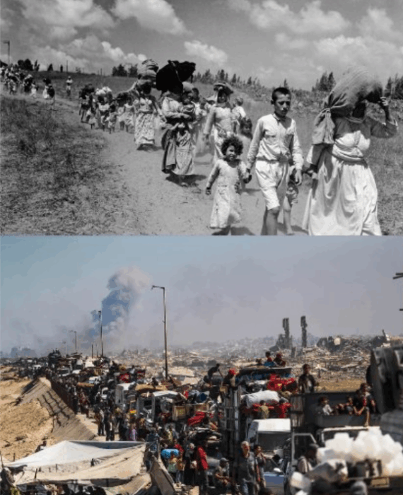 Cette approche s’inspire d’un plan ancien, mis en œuvre lors de la création violente d’Israël en 1948. Les Palestiniens autochtones furent expulsés de force de leurs villes et villages de ce qui était alors la Palestine et repoussés vers les pays voisins. Soutenu par ses alliés occidentaux, l’État israélien établi sur des terres palestiniennes volées a ensuite procédé à la destruction de chaque maison dans des centaines de villages palestiniens.