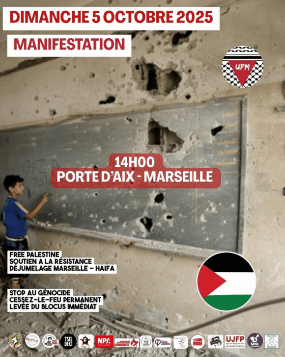 Pour la Palestine et contre le génocide, manifestation MARSEILLE dimanche 5 octobre 14h Porte d’Aix