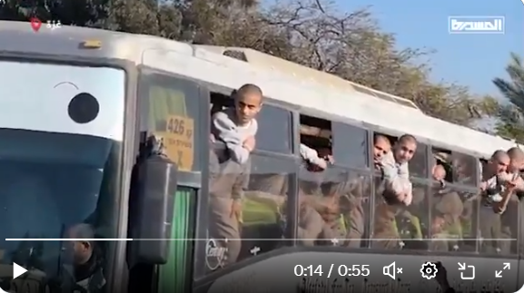 27 février 2025. Arrivée à Gaza de 46 détenus palestiniens, dont des femmes et des mineurs, dans le cadre du septième groupe de l’accord d’échange avec Israël. Tous avaient été enlevés à Gaza sans inculpation et soumis à des mauvais traitements et à la torture dans les camps de détention israéliens. (capture d’écran de la video publiée sur le compte X Suppressed News.)