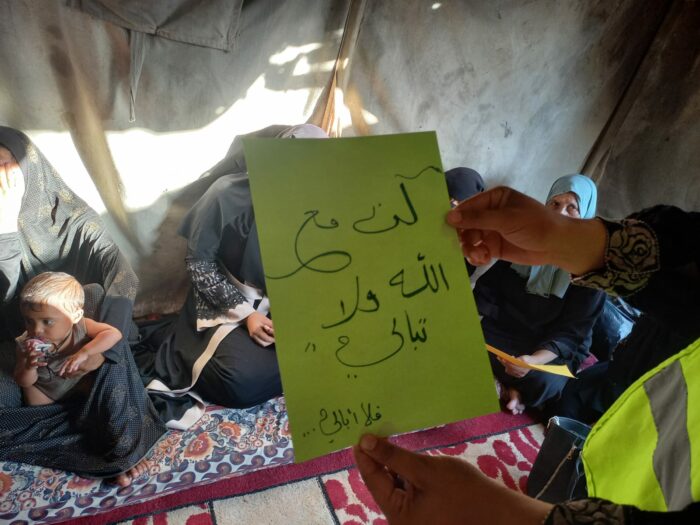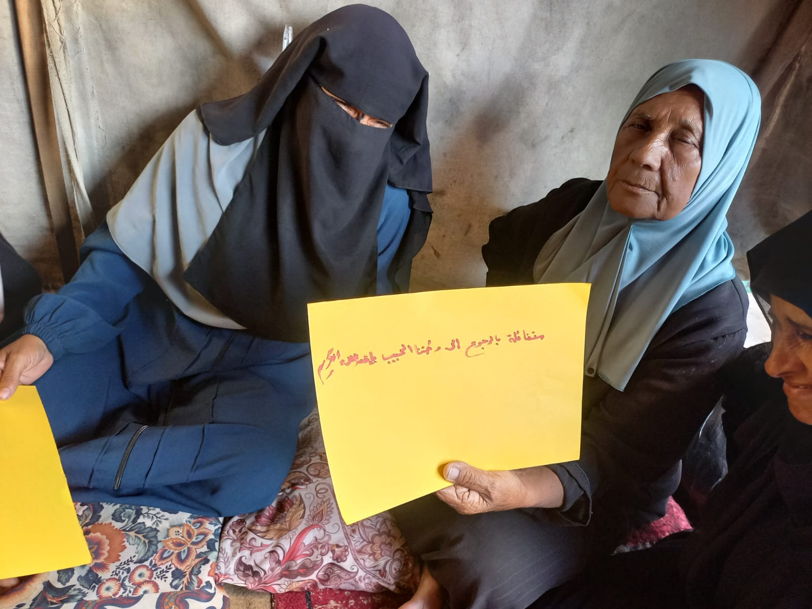 « Par un après-midi gris, alourdi par les souvenirs de l’exil et le bruit du vent frappant les tentes de l’ouest de Deir al-Balah, vingt femmes déplacées se sont réunies dans une petite tente du « camp des amis » à Deir al-Balah. L’objectif de cet atelier, organisé par l’équipe de l’UJFP, était de leur offrir une chance unique de découvrir une force intérieure longtemps recouverte par la poussière de la souffrance, en les formant aux techniques de flexibilité cognitive et au changement des schémas de pensée négatifs ancrés par les pressions du déplacement et les conditions de guerre.