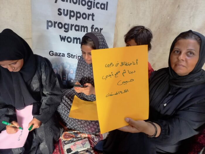Brigitte Challande, 6 octobre 2025.- Continuellement les ateliers de soutien psychologiques pour les femmes s’attaquent aux questions qui permettent de rester debout dans l’enfer de Gaza. Ici celui du 5 octobre.