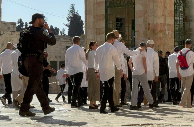 Le nombre de colons ayant pris d’assaut la mosquée Al-Aqsa au cours du mois a dépassé les 5.000. Lors de ces incursions, les colons, menés par des rabbins renommés, ont accompli des rituels religieux publics, notamment en soufflant plusieurs coups de trompette à l’intérieur de la mosquée, en priant, en se prosternant collectivement, en chantant, en dansant et en applaudissant. Ils ont également apporté des instruments de prière sacrés et ont accompli des prières individuelles et collectives dans différentes cours de la mosquée.