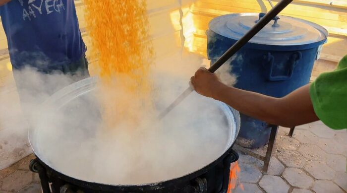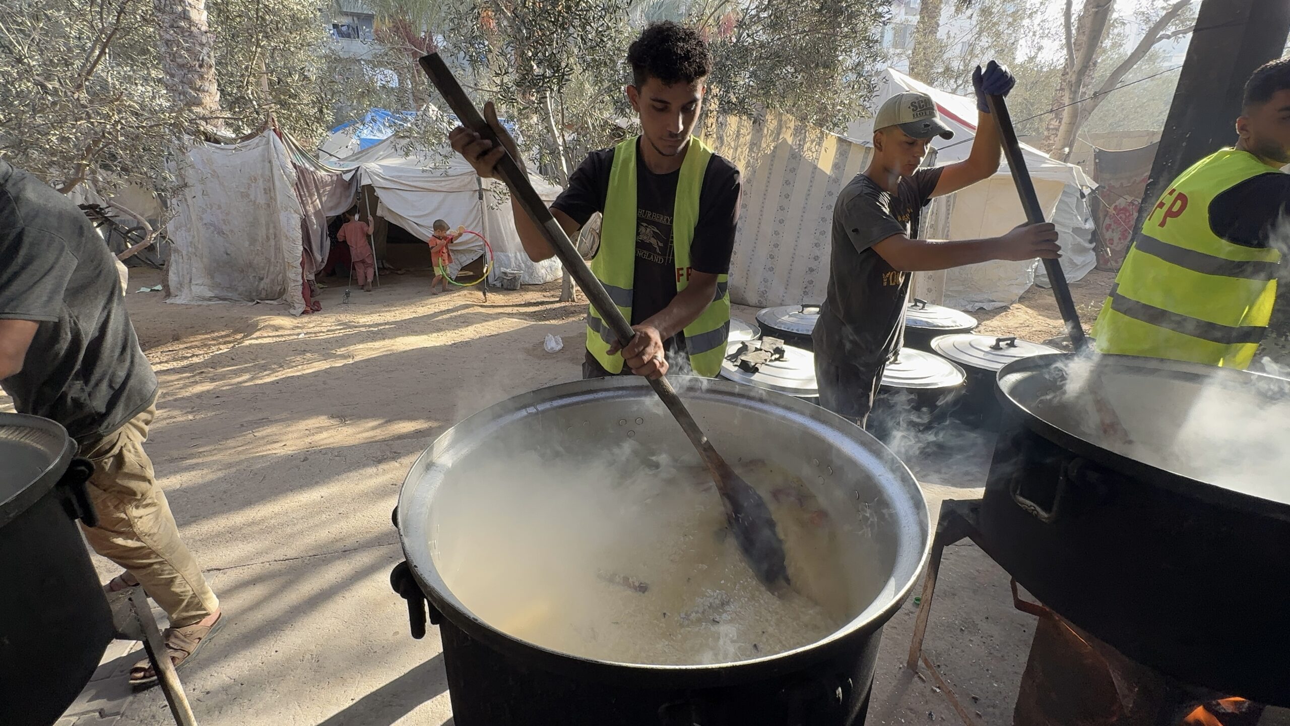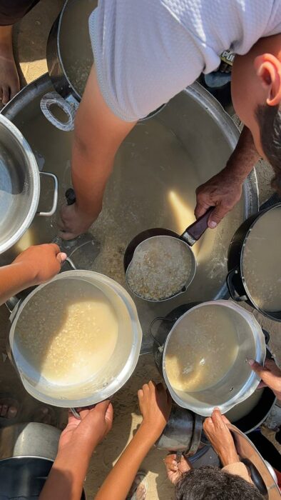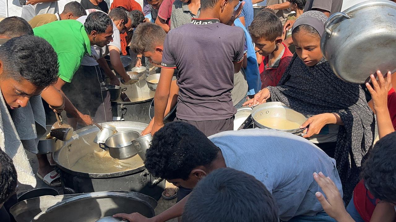 Au cœur de cette tragédie, les équipes de l’UJFP poursuivent leur travail dans Al-Mawasi de Khan Younès, où s’entassent des milliers de familles déplacées qui ont tout perdu : maisons, fermes, et même la capacité d’assurer un repas quotidien à leurs enfants. Là, les repas chauds que les équipes préparent et distribuent deviennent une véritable bouée de survie. Chaque matin, des enfants se tiennent depuis l’aube dans de longues files devant les points de distribution, les yeux emplis d’attente, posant aux membres des équipes la même question simple et douloureuse à la fois : « Qu’allez-vous cuisiner pour nous aujourd’hui ? » Une question qui révèle l’ampleur de la perte vécue par ces petits, eux qui n’ont plus de cuisine chez eux, plus de feu qui brûle, plus de table familiale qui les réunit — seulement ce que leur apportent les efforts humanitaires visant à les maintenir en vie.