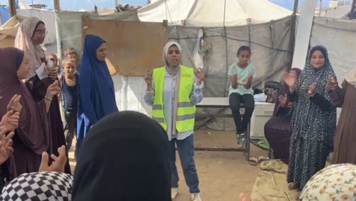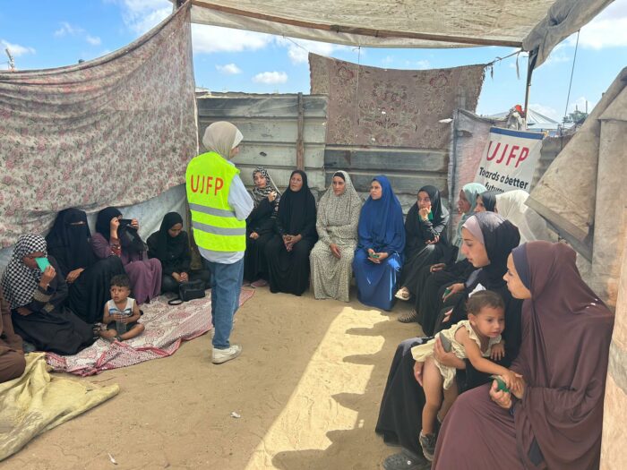 « Dans le camp Al-Irada, à l’ouest de Deir al-Balah, trente femmes déplacées se sont réunies dans une tente. Des femmes alourdies par des années de déplacement, l’amertume de la guerre, la privation et la perte de contrôle, traînant derrière elles la mémoire des conflits et des pertes successives. Pourtant, ce matin-là, elles s’assirent en cercle autour d’une équipe de l’UJFP venue leur offrir une occasion de redécouvrir l’espoir.