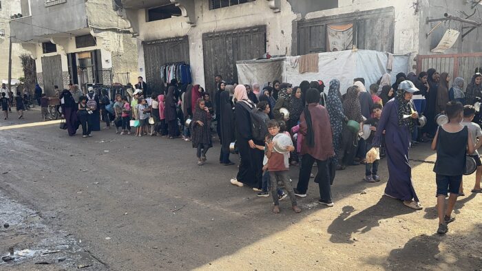Les enfants attendent la nourriture et les femmes libérent l’espoir : le travail humanitaire de l’Ujfp, le 10 octobre, à l’annonce du cessez-le-feu non appliqué.