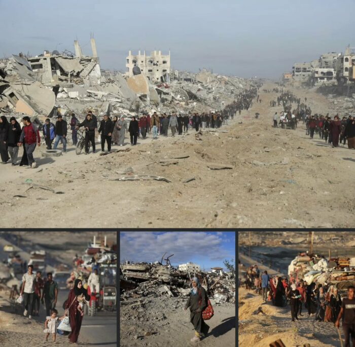 Le long de la route menant à Gaza, des dizaines de milliers de personnes marchent à pied — hommes et femmes, jeunes et vieux — portant sur leurs épaules ce qu’ils ont pu sauver. L’un d’eux dit d’une voix tremblante :