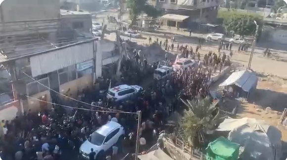 Les Palestiniens scandent des slogans en faveur de la résistance lors de la remise de sept prisonniers israéliens à la Croix-Rouge internationale à Gaza ce matin 13.10 (capture d’écran de la vidéo de Quds News Network).