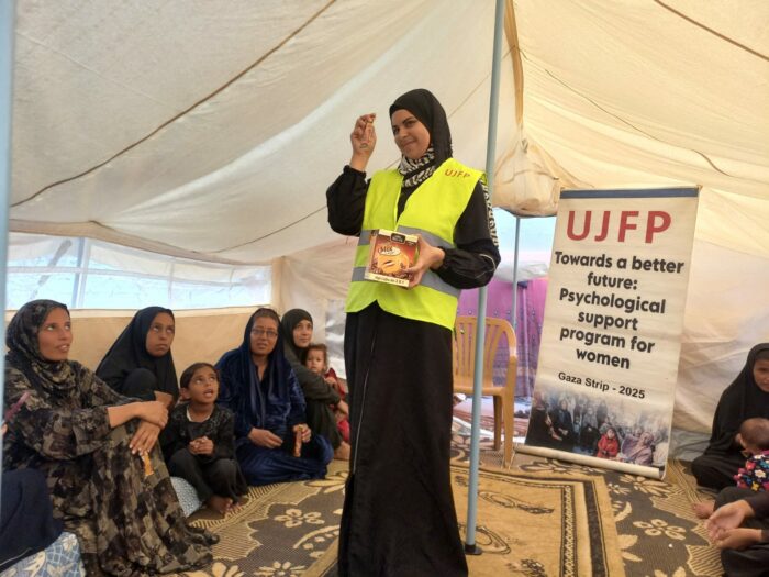 « Alors que le soleil matinal se levait timidement au-dessus des tentes du camp des Amis, à l’ouest de Deir al-Balah, un nouveau sentiment naissait chez les femmes déplacées : un sentiment de vie après la tempête. Dans une petite tente ornée de rires timides et de regards en attente, l’équipe de l’UJFP a poursuivi son travail de soutien à travers une séance intitulée : Le jour d’après la guerre, une séance destinée à semer l’espoir dans le cœur des femmes et à leur redonner le sentiment que demain peut se construire par la volonté, non par l’attente.