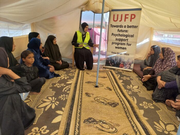 « Dans le calme relatif qui règne sur la zone d’Al-Mawasi à Khan Younès, où les souvenirs douloureux se mêlent aux tentatives de renaître des cendres de la destruction, l’équipe de l’UJFP a poursuivi son travail essentiel en apportant un soutien psychologique spécialisé aux femmes déplacées.