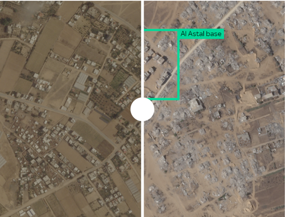 Le quartier autour de la base d’Al Astal a été presque entièrement détruit. Qizan An Najjar, le 12 mai 2023 (à gauche) et le 14 octobre 2025 (SOURCE: Planet Labs PBC)