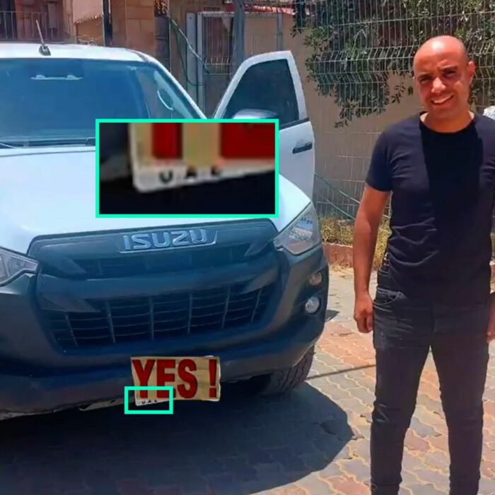 Al Astal affirme utiliser le même concessionnaire. L’un de ses véhicules semble porter une inscription en hébreu, partiellement effacée, sur le côté. (vidéo sur l’article original)