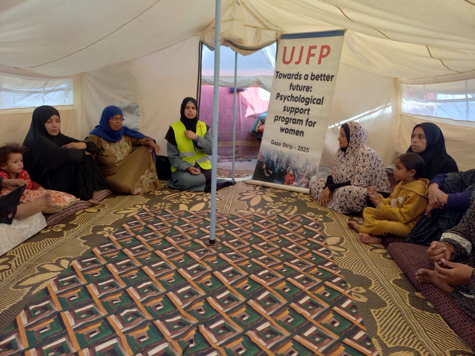 « Dans une réalité humaine éprouvante que vivent les personnes déplacées dans le camp Al-Asdiqaa à l’ouest de Deir al-Balah, où les tentes se touchent, où l’eau manque, et où les visages sont marqués par la fatigue et la nostalgie, les souvenirs des maisons détruites planent encore dans les esprits comme des fantômes douloureux qui ne s’effacent pas. Les équipes de l’UJFP ont poursuivi la mise en œuvre de leurs programmes humanitaires destinés à soutenir les femmes et les familles déplacées. Cet atelier de soutien psychologique, un espace sûr pour survivre dans une réalité impitoyable.