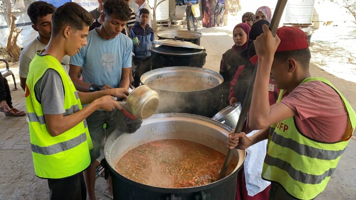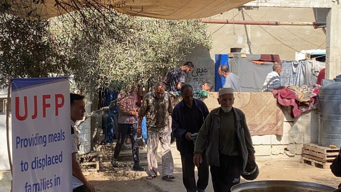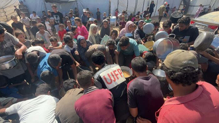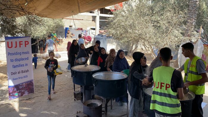 Au milieu de cette tragédie, un rôle humain, celui des équipes de l’UJFP, qui poursuivent leur travail sans relâche dès les premières heures du matin, malgré la dureté des conditions et la pénurie de moyens. Ces anonymes commencent leur journée avec le feu de l’espérance, préparent de grandes marmites, cuisinent des repas chauds variés pour les familles déplacées qui attendent avec impatience.