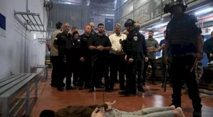 23 octobre 2025. De manière sadique, le ministre fasciste israélien Ben-Gvir menace d’exécution les prisonniers palestiniens dans les prisons israéliennes alors qu’ils sont forcés de s’allonger sur le sol, les mains menottées. (source Mustafa Barghouti sur X)