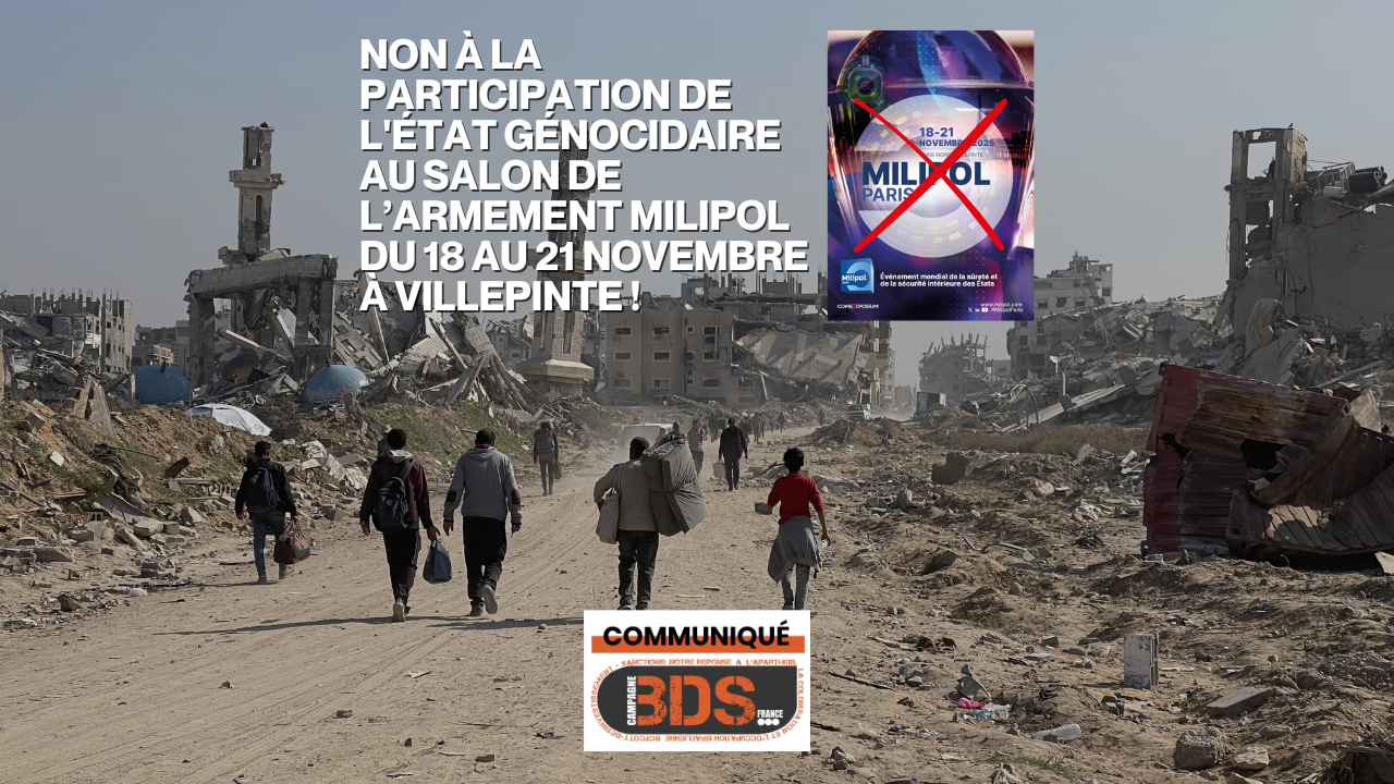 Campagne BDS contre la participation d’Israël au salon Milipol. Source BDS