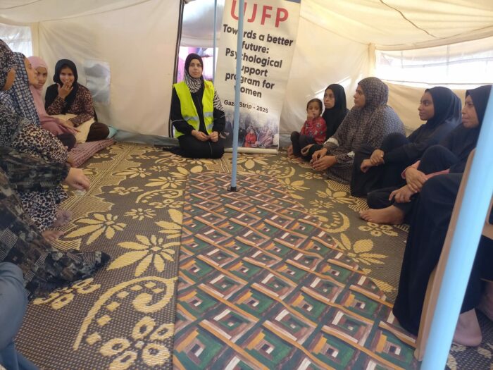« Depuis le début de la guerre et la transformation des maisons en souvenirs suspendus dans l’air, les femmes déplacées se sont retrouvées face à un quotidien plus lourd que ce que l’on peut supporter. Avec la persistance de la crise humanitaire et l’absence des besoins fondamentaux, la femme s’est retrouvée portant sur ses épaules des charges multipliées : la charge de survivre, de protéger ses enfants, et d’affronter une société qui ne lui laisse aucune place pour la fragilité. Chaque jour qui passait, leurs voix étouffées cherchaient une occasion d’être entendues, un espace sûr pour retrouver une part de soi épuisée par des expériences successives. L’atelier mis en œuvre par les équipes de l’UJFP est venu offrir une pause au milieu du chemin : un moment où les femmes pouvaient retrouver une partie de leur force intérieure et découvrir que l’âme peut respirer même au cœur des grandes pertes.