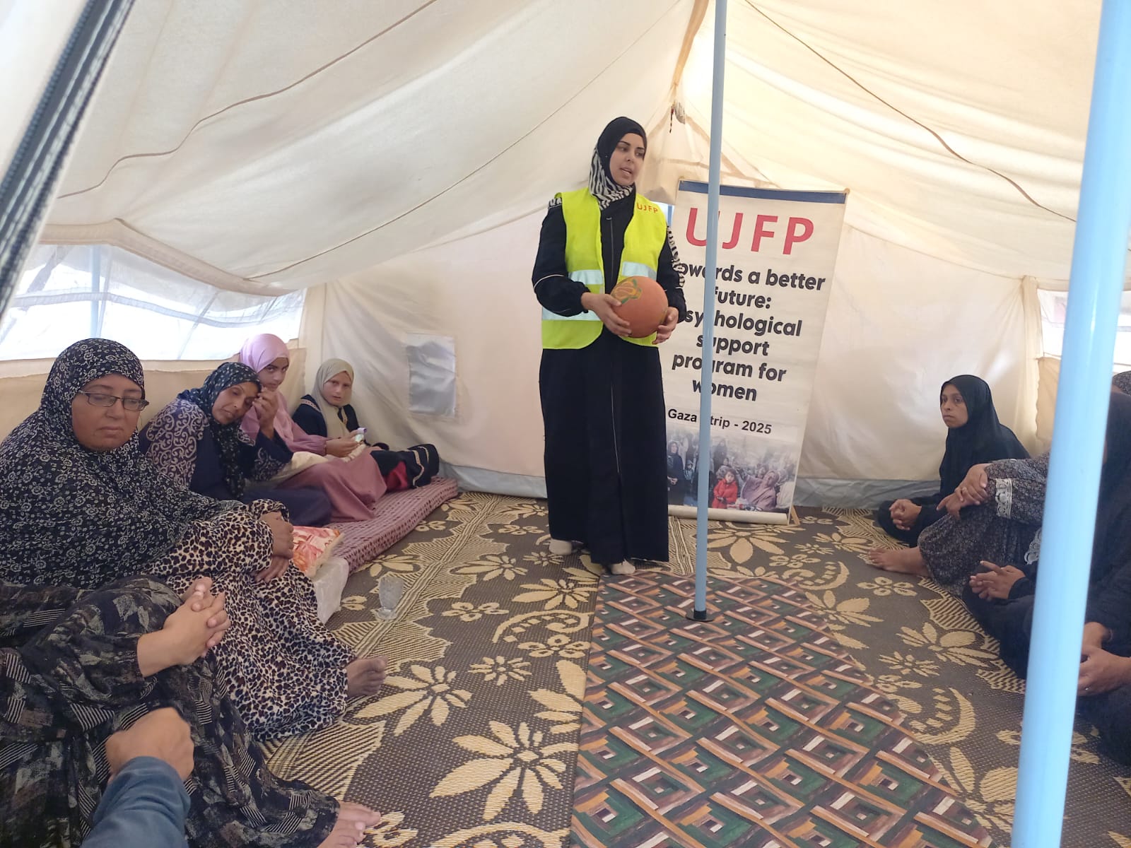 « Depuis le début de la guerre et la transformation des maisons en souvenirs suspendus dans l’air, les femmes déplacées se sont retrouvées face à un quotidien plus lourd que ce que l’on peut supporter. Avec la persistance de la crise humanitaire et l’absence des besoins fondamentaux, la femme s’est retrouvée portant sur ses épaules des charges multipliées : la charge de survivre, de protéger ses enfants, et d’affronter une société qui ne lui laisse aucune place pour la fragilité. Chaque jour qui passait, leurs voix étouffées cherchaient une occasion d’être entendues, un espace sûr pour retrouver une part de soi épuisée par des expériences successives. L’atelier mis en œuvre par les équipes de l’UJFP est venu offrir une pause au milieu du chemin : un moment où les femmes pouvaient retrouver une partie de leur force intérieure et découvrir que l’âme peut respirer même au cœur des grandes pertes.