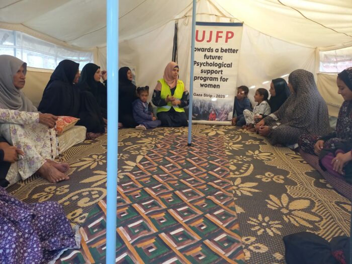 Au milieu de ce tableau, l’équipe de l’UJFP a entamé la deuxième séance, intitulée Chaleur intérieure malgré le froid de la guerre, un espace psychologique sûr, un refuge affectif pour trente femmes déplacées assises ensemble, portant leurs histoires et leurs douleurs, partageant de rares moments d’apaisement.