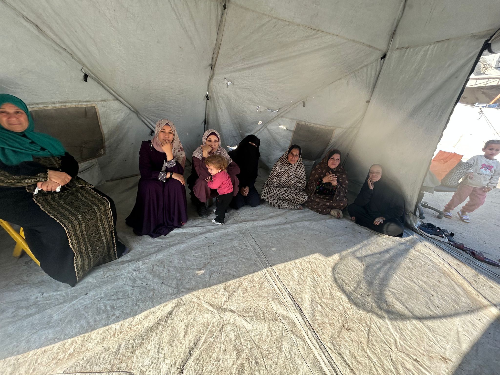 L’atelier mis en œuvre par l’équipe de l’UJFP a eu lieu dans la tente dédiée, en tissu comme les autres tentes, mais quelque chose y était plus chaleureux. Aux alentours de 10h, les femmes commencèrent à affluer. L’une tenait son enfant agrippé à sa poitrine, effrayé par l’air glacial ; une autre guidait sa mère âgée qui s’appuyait sur elle, redoutant que son corps épuisé ne cède à tout moment ; une troisième regardait autour d’elle à la recherche d’un visage familier pour se rassurer avant d’entrer. La tente se remplit progressivement de voix discrètes, de petits rires, de regards hésitants et de conversations interrompues chaque fois qu’une bourrasque plus forte que la précédente secouait les toiles. Vingt-cinq femmes étaient présentes, entourées de couches de boue à l’entrée de la tente.