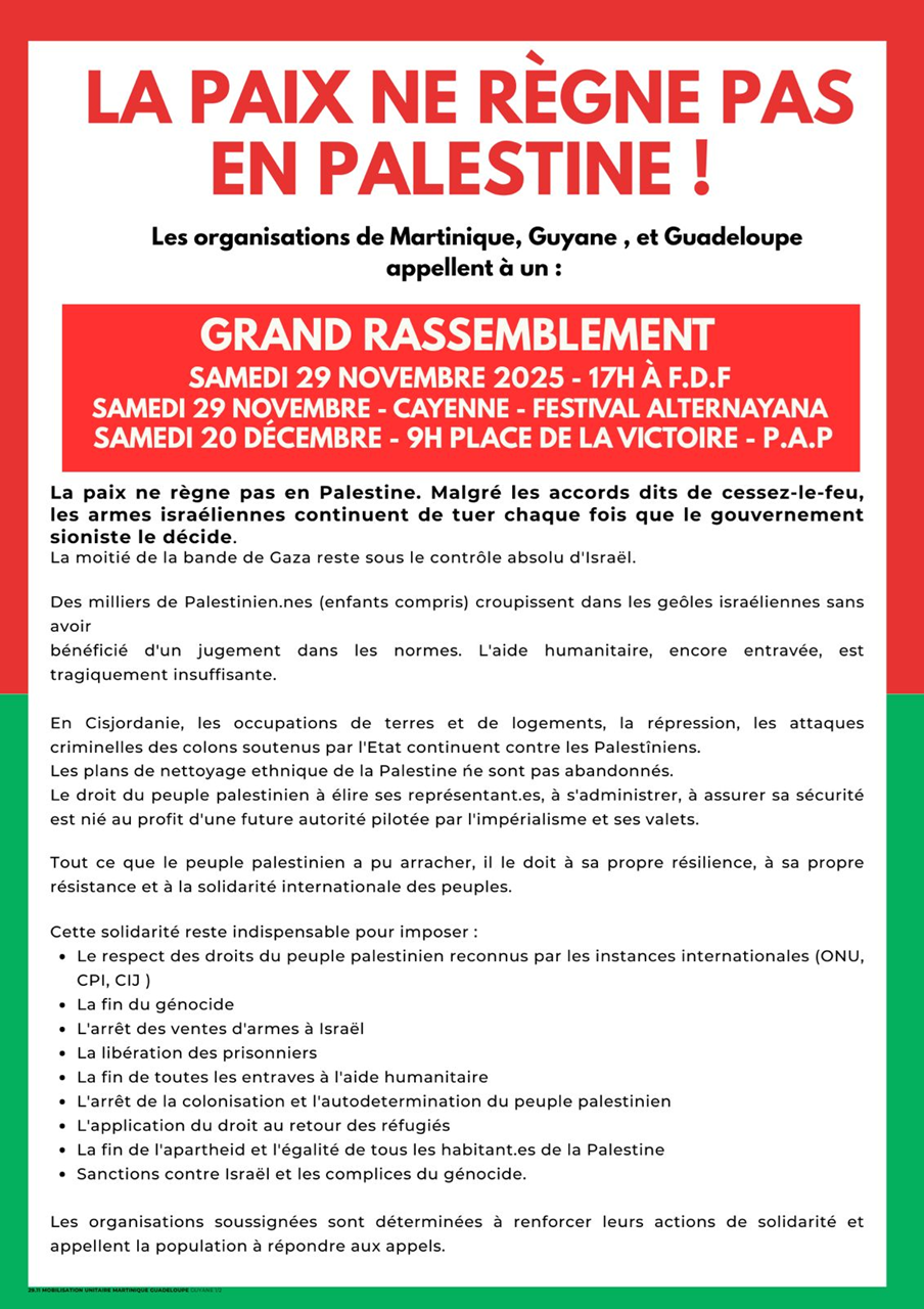 GRANDS RASSEMBLEMENTS PALESTINE EN MARTINIQUE, GUYANE et GUADELOUPE – 29/11 FORT-DE-FRANCE/CAYENNE – 20/12 POINTE A PITRE