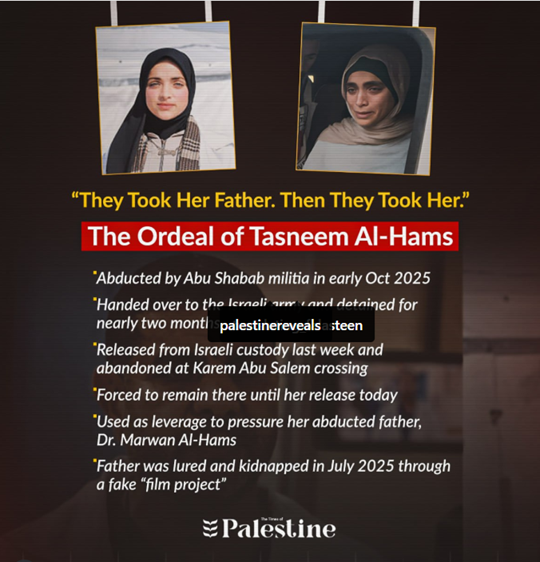 Quds News Network, 27 novembre 2025.De nouvelles images révèlent comment le médecin palestinien Marwan Al-Hams a été enlevé par les forces israéliennes en juillet, pendant le génocide. Une journaliste française l’a attiré dans un guet-apens en prétendant réaliser un documentaire sur son travail médical.