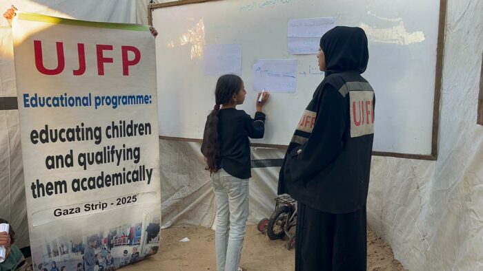 L’UJFP a commencé son parcours en créant le premier centre éducatif dans le camp Al-Fajr à Mawasi Khan Younès. Bien que dépourvu de moyens, il débordait d’une vie nouvelle en train de se former. Après le succès de ce premier centre, l’UJFP a rapidement établi un second centre dans le camp Al-Azza au sud de Deir al-Balah, puis un troisième dans le camp Al-Baladiya, au centre de Deir al-Balah, un quatrième dans le camp Al-Amal, avant de conclure cette série par l’ouverture de l’école Le Premier Pas à l’ouest de Nuseirat. Ces centres n’étaient pas de simples lieux d’apprentissage ; ils étaient des points de lumière dans la longue nuit de Gaza, de petites flammes allumées face à l’obscurité, dissipant l’ombre de l’ignorance que la guerre avait voulu imposer à une génération entière. Des milliers d’enfants ont bénéficié de ces centres, retrouvant une part de la vie qui leur avait été confisquée. Ils se sont assis sur des bancs d’école improvisés, ont tenu cahiers et crayons, et ont suivi des cours parfois accompagnés du bruit des explosions — mais ils ont persisté.