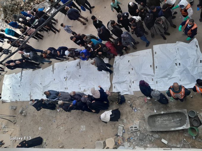 « Depuis ce matin (14.12), les équipes de la protection civile ont récupéré 14 corps sur les 85 appartenant à la famille Salem, tuée par les forces d’occupation israéliennes plus tôt dans la journée lors du génocide en cours à Gaza. » (source compte X de Motasem A. Dallul).
