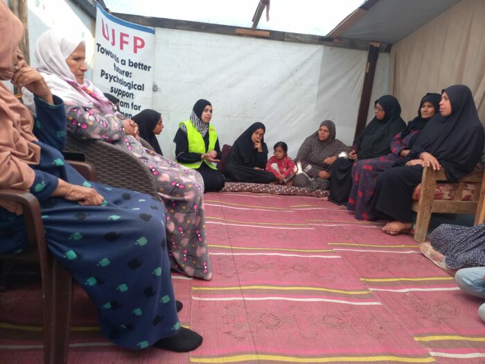 Les équipes de l’UJFP ont organisé cette semaine un atelier spécialisé de soutien psychologique dans le camp Al-Asdiqa, à l’ouest de la ville de Deir al-Balah, avec la participation de vingt-cinq femmes déplacées. Celles-ci se sont réunies dans un même espace en portant des expériences similaires de perte, de peur et de pression psychologique, mais aussi le désir de comprendre, d’apprendre et de trouver des outils leur permettant de cohabiter avec leur réalité difficile.