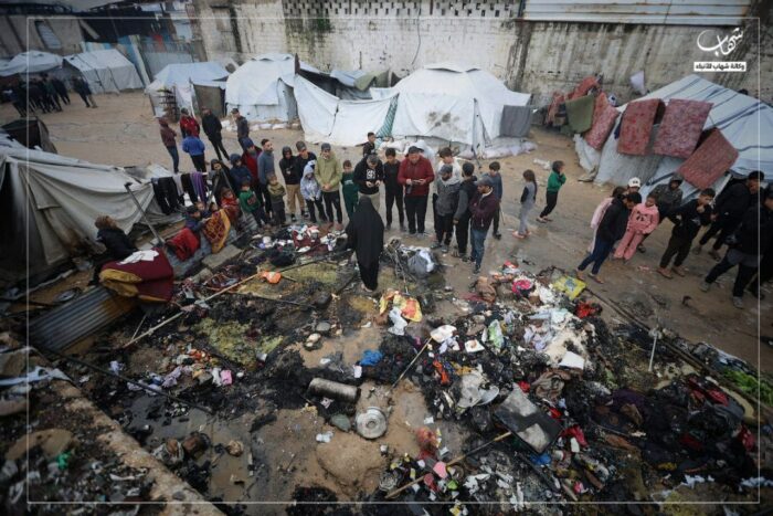 Des Palestiniens inspectent les restes de la tente d’Amal Abu Al-Kheir après un incendie nocturne qui s’est déclaré dans le camp de déplacés de Yarmouk, à Gaza-ville, et qui l’a tuée ainsi que son petit-fils de cinq ans, Saud Mohammad Abu Al-Kheir. (source Quds News Network)