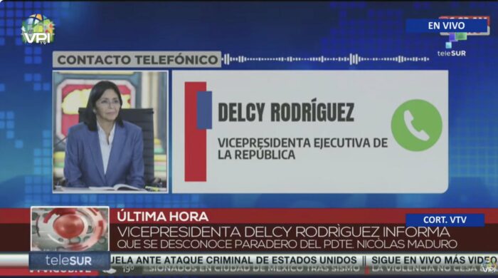 Plus tard, la vice-présidente vénézuélienne, Delcy Rodriguez, a déclaré dans un message vocal diffusé à la télévision d’État (photo ci-dessus) que le gouvernement vénézuélien ignorait où se trouvaient le président Maduro et son épouse.