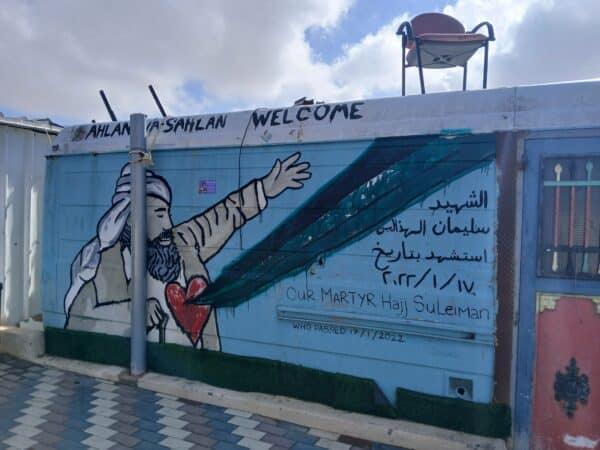 La communauté d’Umm al-Khair est riche et dynamique, unie par des liens familiaux, une loyauté et un engagement profonds. Awdah n’était qu’un des nombreux leaders de la communauté, et si les occupants pensaient que son assassinat saperait la résistance des villageois, ils se trompaient lourdement. Nous avons rencontré un cousin d’Awdah, qui a grandi en apprenant de lui et qui a repris nombre de ses responsabilités, travaillé avec des militants internationaux et soutenu sa veuve et ses trois adorables fils. Il nous a raconté de nombreuses histoires sur la famille et leur histoire ici, notamment son arrestation à l’adolescence et les coups reçus en prison avant d’être relâché en pleine nuit, loin de chez lui, sans argent ni téléphone. Il nous a parlé de l’impact de la mort d’Awdah et de la façon dont les colons viennent à la clôture de barbelés qu’ils ont construite et crient aux villageois : « Où est Awdah ? Où est Suleiman ? [Un autre martyr du village]. On ne les a pas vus récemment. »