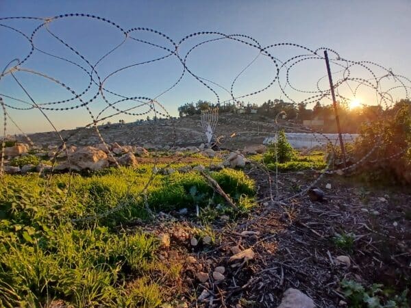 Les bâtiments jaunes de la colonie, la menorah et les barbelés installés par les colons se trouvent juste derrière le terrain de football d’Umm al-Khair.