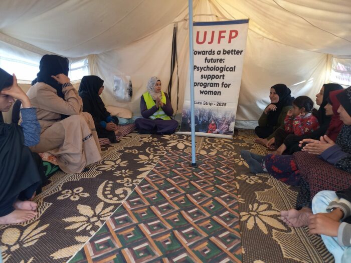 L’équipe de l’UJFP a mis en œuvre une séance de sensibilisation médicale qualitative au camp Al-Asdiqa, à l’ouest de Deir Al-Balah – dans la région centrale. Cette activité a ciblé 25 participantes parmi les femmes et les mères déplacées, afin de protéger les enfants et les personnes âgées contre les rhumes et la grippe qui minent leur santé en silence.