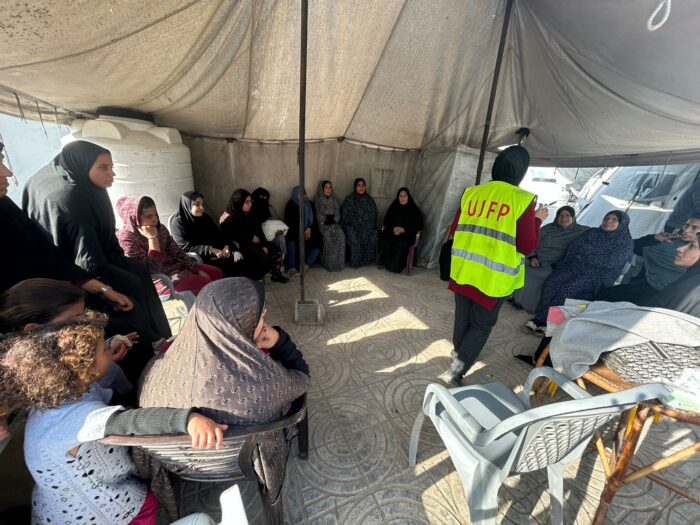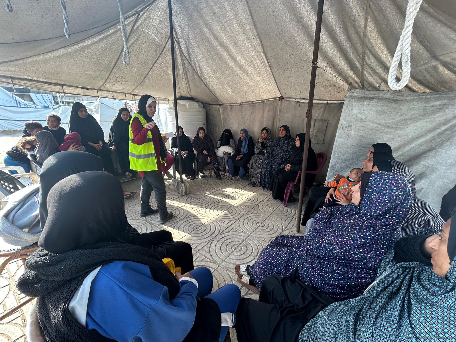 La séance de soutien psychologique mise en œuvre par l’équipe de l’UJFP dans le camp d’Al-Ard Al-Katiba, à l’ouest de la ville de Gaza, en présence de 30 femmes déplacées : Malgré le déplacement, nous sommes plus fortes, notre voix, c’est la vie.