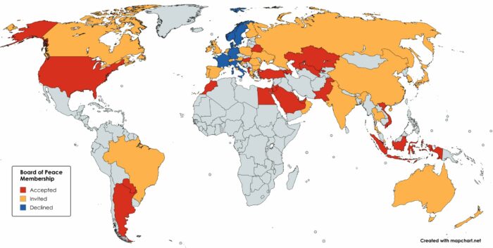 En rouge : les pays ayant accepté de faire partie du « conseil de la paix » ; en orange : les pays invités ; en bleu, les pays ayant refusé.