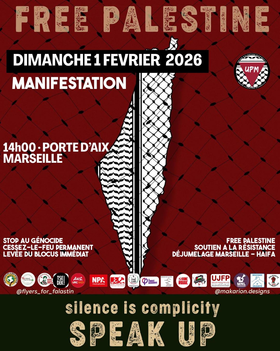A Marseille aussi, nous faisons partie de la population mondiale, et nous serons dans la rue dimanche 1er février à 14H à la Porte d’Aix, pour que l’être humain soit libre en Palestine et dans le monde entier ! Contre le génocide et tout colonialisme ! Contre la domination de l’axe usraélien !