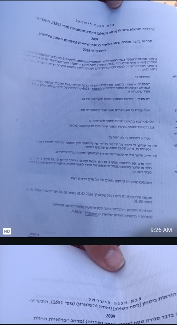 Le 1er février, les forces militaires israéliennes ont mené un énième raid, émettant un ordre de CMZ (zone militaire fermée) (photo ci-dessus) d’une journée sans la clause permettant aux habitant.e.s de rester sur leurs terres. Il s’agit d’un acte illégal et d’une intensification des manoeuvres mises en place pour le nettoyage ethnique des communautés palestiniennes, c’est en tout cas ce qu’a affirmé l’Etat israélien lors de l’audience de révocation du visa. Malgré cette intimidation, les membres de la famille Abu Najeh ont décidé de ne pas quitter leur maison. Lors du raid, les forces israéliennes ont arrêté les citoyen.ne.s français.e.s Momo et Camille. Iels sont actuellement au centre de détention Ben Gurion et contestent leur ordre d’expulsion. Les vols de Momo et Camille sont prévus le vendredi 6 février.