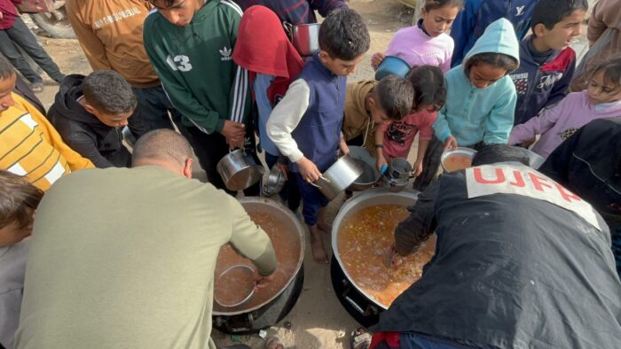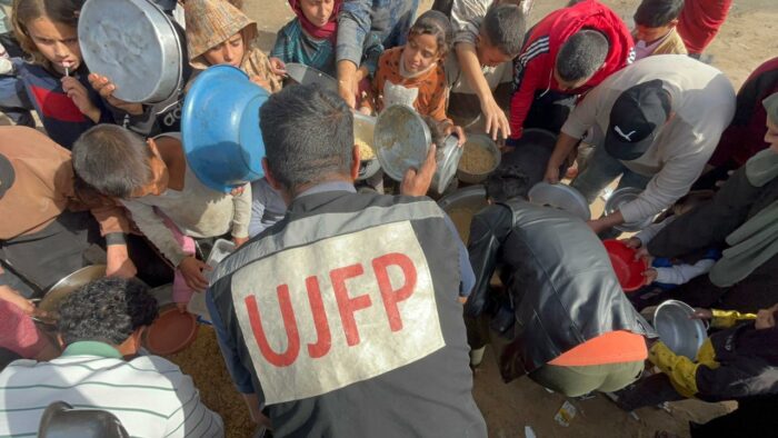 À travers ses centres actifs dans la zone d’Al-Mawasi à Khan Younès et à Deir al-Balah, l’UJFP poursuit la distribution quotidienne de repas aux familles sinistrées contraintes d’abandonner leurs terr.es et leurs moyens de subsistance. Dans les camps d’Al-Fajr et d’Al-Sumoud, qui accueillent des milliers de familles d’agriculteurs déplacés de l’est de Khan Younès, les mères et les enfants commencent à attendre dès les premières heures du matin pour obtenir des repas leur permettant de survivre un jour de plus. Dans ces espaces surpeuplés, les marmites de nourriture qui mijotent lentement deviennent un point d’espoir quotidien, tandis que les enfants guettent ce que ces repas peuvent leur offrir pour apaiser la faim et calmer l’angoisse.