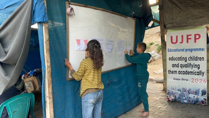 « À Gaza, l’interruption de l’éducation n’est plus un risque futur, mais une réalité quotidienne qui menace toute une génération. Avec la destruction des écoles et la transformation de nombreuses d’entre elles en centres d’hébergement, les enfants sont privés de la routine éducative qui représente un élément essentiel d’équilibre dans leur vie. Face à ce défi, l’UJFP a contribué à la création d’espaces éducatifs alternatifs au sein des camps et des zones de déplacement, afin d’assurer un enseignement de base, un accompagnement pédagogique et des activités éducatives interactives. Offrir aux enfants la possibilité d’être des élèves plutôt que de simples survivants.