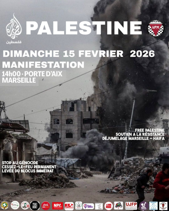 Pour Gaza Pour toute la Palestine, libre de la mer au Jourdain Contre le génocide, l’occupation et l’impunité Contre la complicité de l’Occident et contre ses guerres impérialistes. Pour la justice sur terre et pour le droit des peuples à disposer d’eux-mêmes ! Tous dans la rue dimanche 15 février 2026 à 10H à la Porte d’Aix (Et samedi 14 à partir de 17H au Vieux Port)