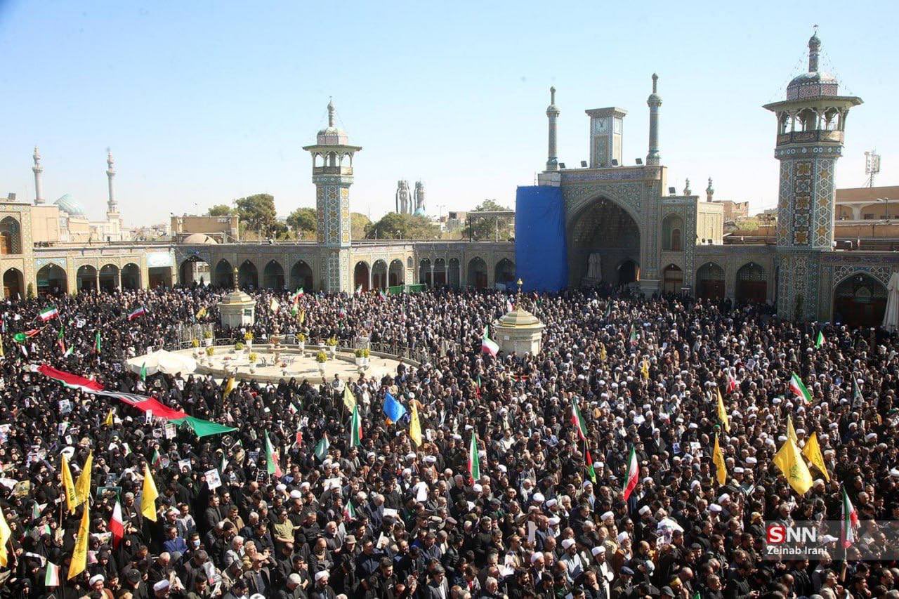 Une foule nombreuse participe au cortège funèbre des victimes des frappes aériennes US-israéliennes à Qom, en Iran. (source Al Jarmaq)