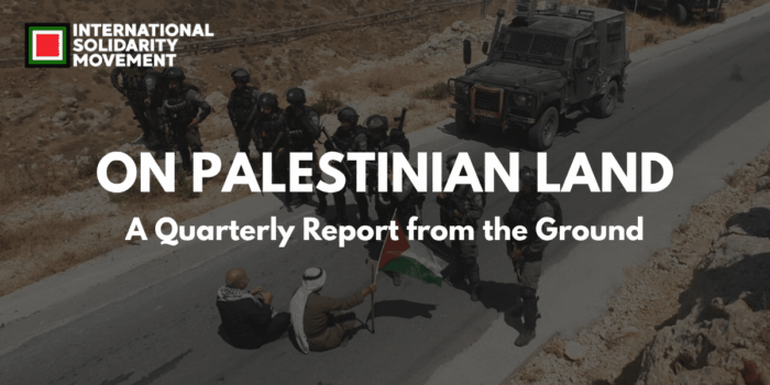 ISM-Palestine, 10 mars 2026.– Bienvenue dans la lettre d’information trimestrielle 02 du Mouvement de Solidarité Internationale ! De nombreux reportages sur les actes de violence coloniale et la résistance palestinienne sont souvent noyés dans les flux d’actualités en raison de la répression des journalistes et de la focalisation de l’attention sur Gaza. Pour y remédier, nous publierons des mises à jour tous les trois mois depuis les différentes zones de Cisjordanie où nous sommes présent.es.