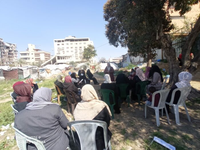 C’est dans ce contexte que l’équipe de l’UJFP a organisé une séance de soutien psychologique et de libération émotionnelle à l’occasion de la Journée internationale des femmes. Cette journée a ainsi pris un sens différent des célébrations traditionnelles. Ici, il ne s’agissait pas seulement d’une date symbolique, mais d’une véritable opportunité d’écouter les voix des femmes qui vivent cette expérience dans toutes ses dimensions. Vingt-cinq femmes se sont réunies sous l’une des tentes du camp, transformant l’espace, pendant quelques heures, en un lieu profondément humain rempli d’histoires, de souvenirs et d’espoirs.