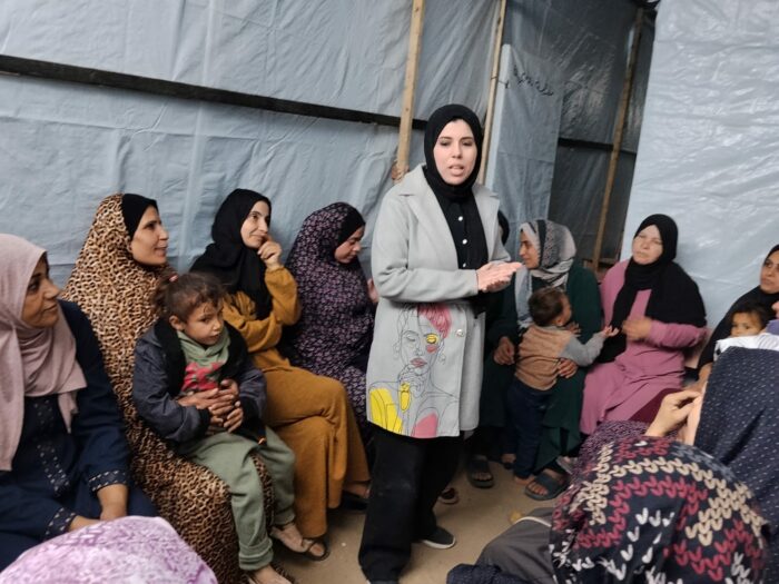 L’équipe de l’UJFP a organisé une séance au Camp des Amis, à l’ouest de Deir el-Balah, avec la participation de 20 femmes. La session était un espace interactif combinant éducation sanitaire, soutien psychologique et social.