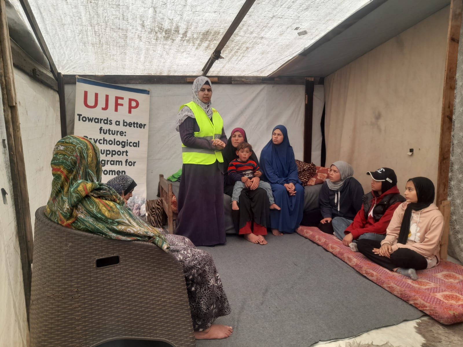 L’équipe de l’UJFP a organisé une séance au Camp des Amis, à l’ouest de Deir el-Balah, avec la participation de 20 femmes. La session était un espace interactif combinant éducation sanitaire, soutien psychologique et social.