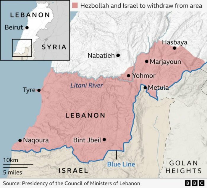 En rose : la zone du sud Liban dont Israël essaie de s’emparer depuis un demi-siècle, et en a été empêché par la résistance libanaise. Pour le régime d’occupation, les eaux du fleuve Litani sont indispensables à la constitution du Grand Israël.