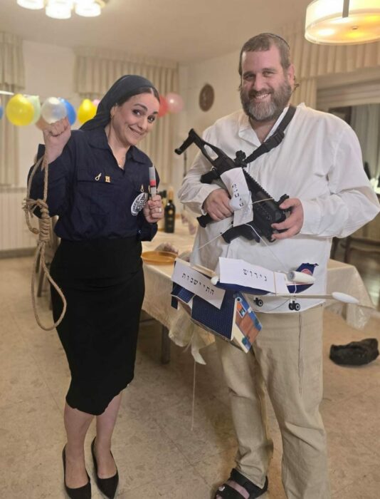 La vice-présidente de la Knesset israélienne, Limor Son Har-Melech, telle qu’elle est apparue déguisée sur le thème « Peine de mort pour les terroristes ». Elle porte un uniforme ressemblant à celui de l’administration pénitentiaire israélienne, ainsi que des insignes représentant un nœud coulant et le « Troisième Temple ». Elle tient à la main un nœud coulant et une seringue, éléments de son costume. Le costume de son mari illustre les thèmes « Occupation, Expulsion, Colonisation ». Il porte un pistolet factice étiqueté « Occupation », une maquette d’avion marquée « Expulsion » et une maison miniature étiquetée « Colonisation ».