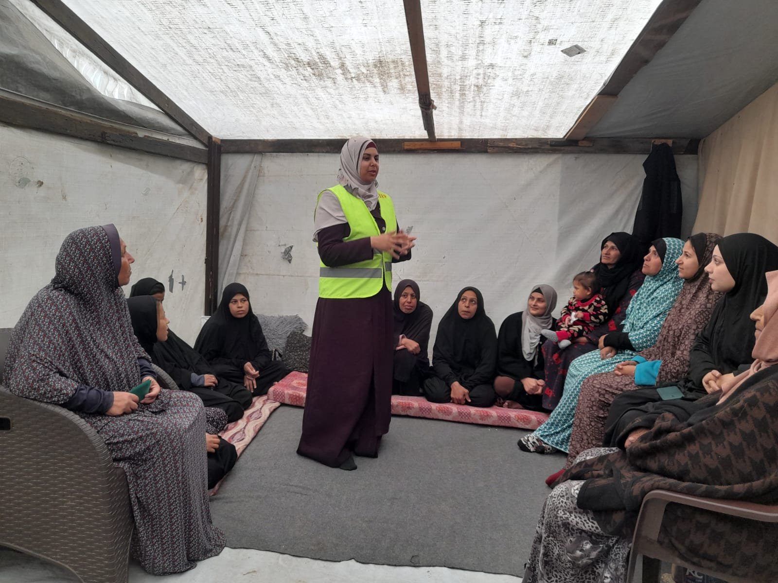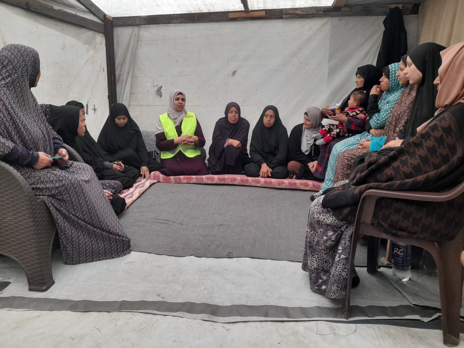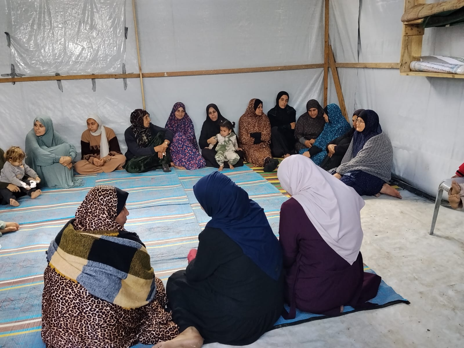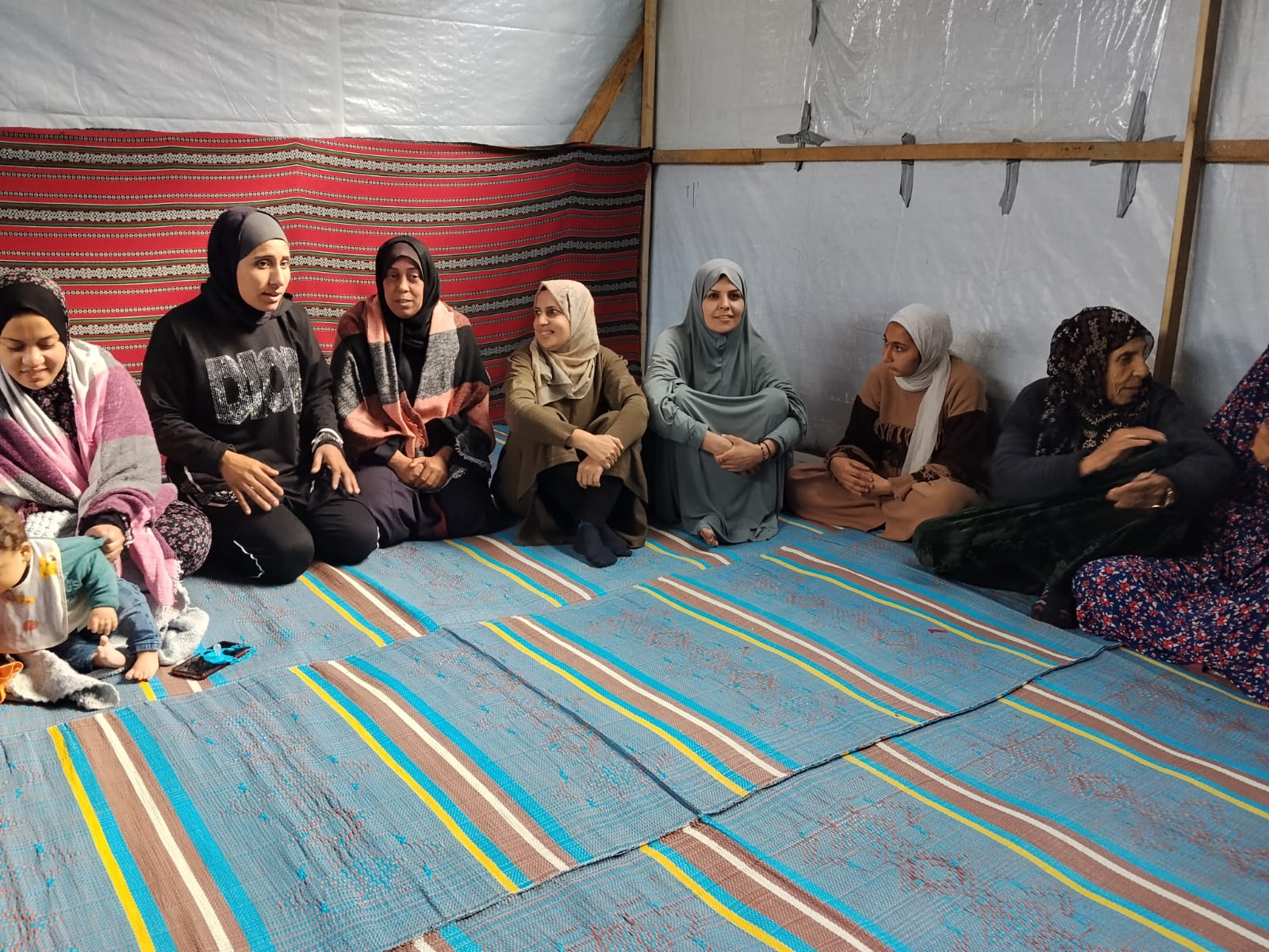 Dans ce cadre a été organisée la séance : Ensemble, nous surmontons les difficulté, le réseau de sécurité, mise en œuvre par l’équipe UJFP dans le camp d’Al-Israa, à l’ouest de Gaza, avec la participation de 25 femmes déplacées. Cette rencontre a ouvert un véritable espace de dialogue sur la manière de transformer cette proximité contrainte en source de force plutôt qu’en facteur de pression supplémentaire.