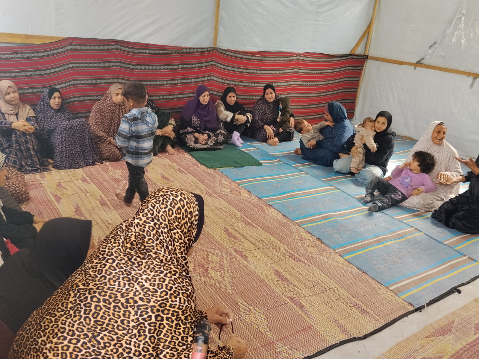 « Dans la zone centrale, à l’ouest de Deir al-Balah, au sein du camp Al-Durra, où les tentes sont si rapprochées qu’elles semblent se toucher, l’organisation UJFP a mis en place une séance de soutien psychologique réunissant 20 femmes déplacées.