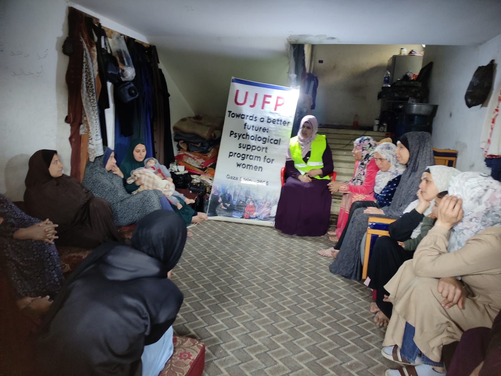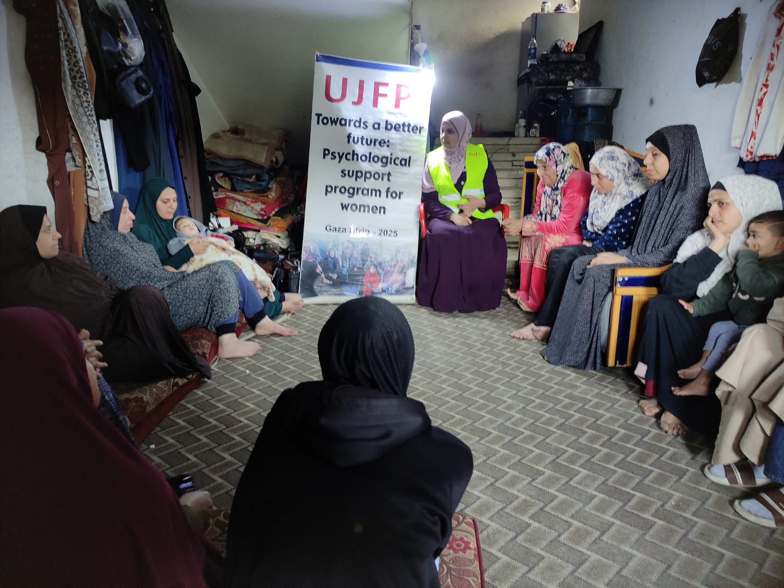 « À l’ouest de Gaza, dans le camp d’Al-Israa, où les tentes s’étendent dans un espace étroit, l’UJFP a organisé une séance de soutien psychologique pour 25 femmes déplacées, dans une tentative d’ouvrir un espace humain où elles peuvent reprendre leur souffle au milieu d’une réalité qui ne s’apaise jamais.